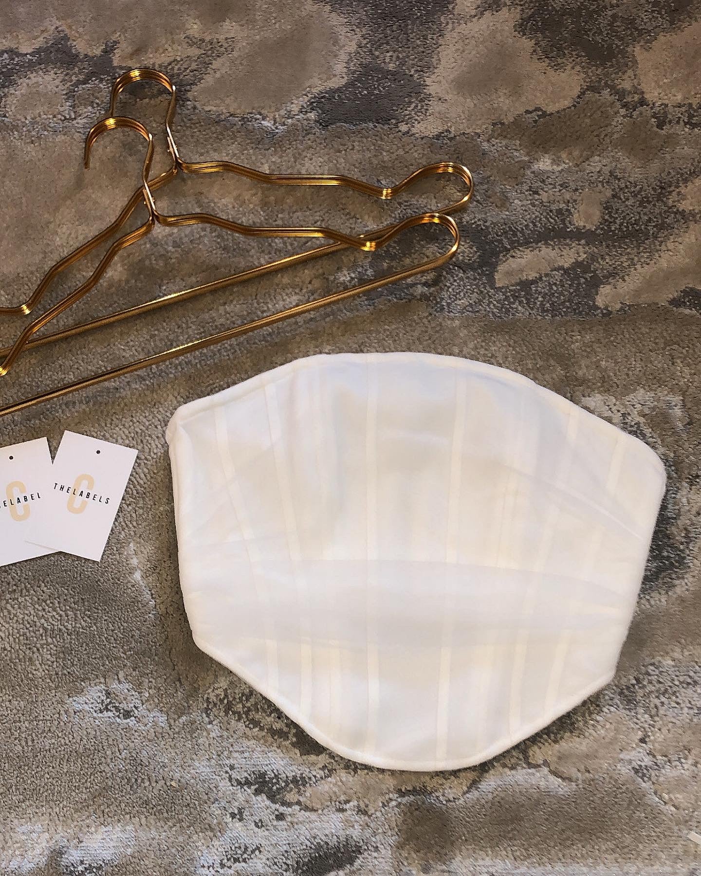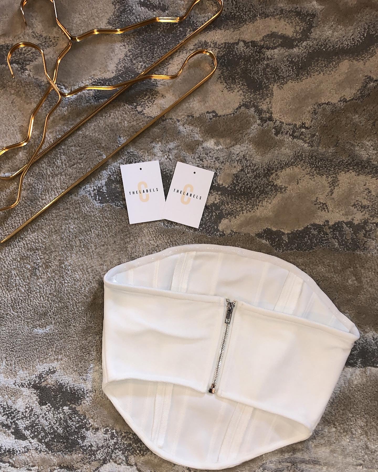 The top is a corset style cropped bandeau, with a zip back. The skirt is a zip back with tie ruched design and a zip back.