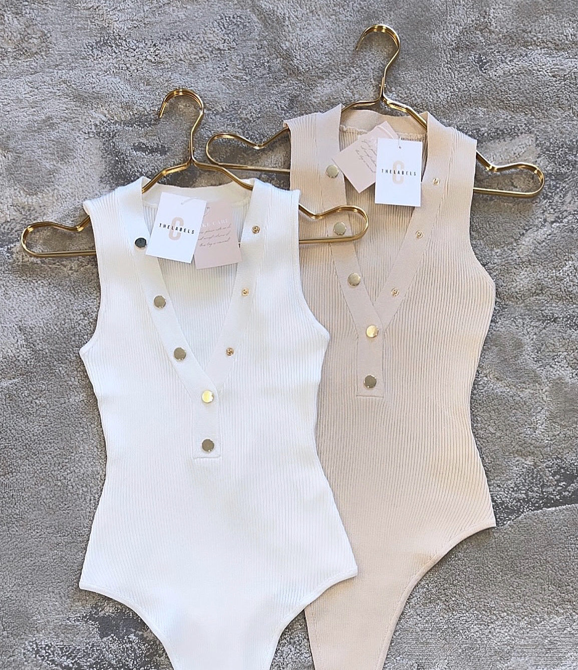 Our Pollie Premium Button Bodysuit a non high rise version features a stretch ribbed material, gold button detailing.